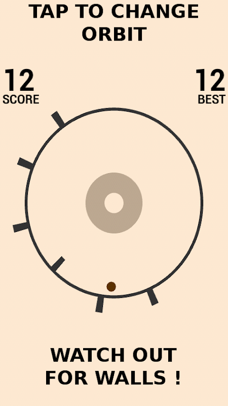 You are small dot orbiting around large circle. You can't jump, but you can switch side! Just tap screen to change side. Don't step on the wall! Avoid it at all costs. Cause when you step on wall, it's game over!