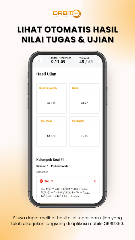 부정 행위 감지 기능(학생들이 더 정직해지도록 도와줌), 항목 분석 기능(품질 과제 및 시험 보장), 커리큘럼 사용자 정의 기능(K13 및 Merdeka Learn), 자료 관리 기능, 과제 및 시험(보내는 것만큼 쉬움)을 포함한 ORBIT360의 우수한 기능을 즐기십시오. 이메일), 전자 보고서 기능(평가 결과 자동 요약), 수백 개의 학습 콘텐츠 및 수천 개의 질문 은행, 교사를 위한 특별 업그레이드 세션.