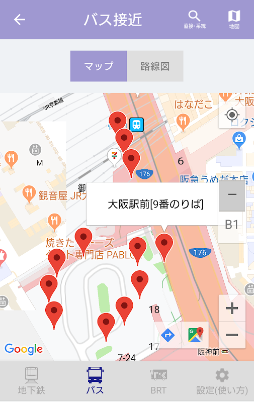 버스 접근 정보 등 운행 정보 앱의 모든 기능은 "e METRO 앱"(Osaka Metro 공식 앱)에서 이용하실 수 있으므로 꼭 다운로드를 부탁드립니다.