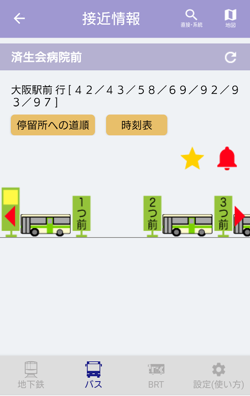 자주 이용하는 정류소와 계통·행선지를 「즐겨찾기」에 등록해 두는 것으로, 톱 화면에서 2탭으로 버스 접근 정보를 보실 수 있습니다.