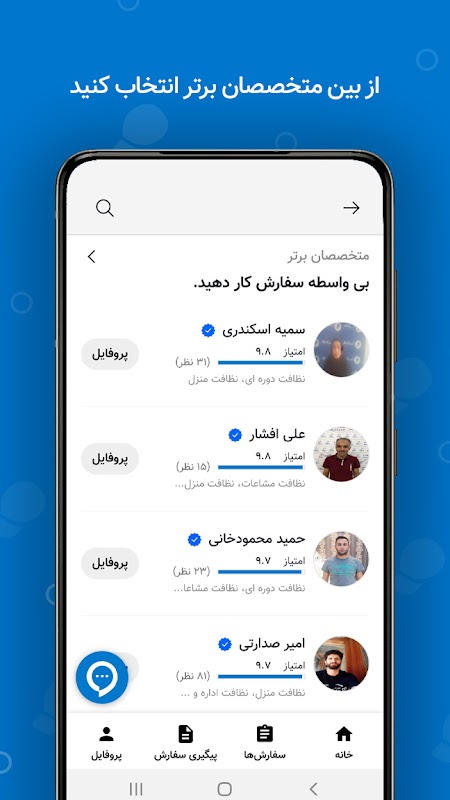 Master Master 온라인 서비스 어플리케이션은 전문적인 전문가와 모바일 수리공을 소개하여 보다 쉽고 빠르게 작업을 도와드립니다. 이 서비스 플랫폼은 필요한 모든 것을 제공합니다. 이 애플리케이션을 통해 완전 무료로 다양한 서비스의 가격과 비용을 알아보고 모든 분야의 전문가와 연락하십시오. 소개받은 각 사람의 프로필을 비교하고 자신의 직업을 사용한 다른 사람들의 경험을 연구하고 전문가를 비교함으로써 더 나은 선택을 할 수도 있습니다. 집, 아파트 및 건물 작업을 주인의 서비스를 요청하는 지능형 시스템에 맡기고 싶다면 첫 주문에 대해 할인 코드 WELcome00을 사용하여 35,000 Tomans의 선물을 받을 수 있습니다. 소셜 네트워크에서 마스터를 팔로우하여 이 애플리케이션에 대한 더 많은 할인 정보를 찾을 수도 있습니다.