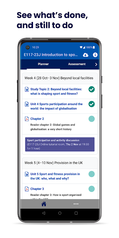 • OU Study 앱과 모듈 웹사이트가 동기화됩니다. 완료된 자료를 체크하거나 답을 저장하면 모듈 웹사이트와 앱이 모두 업데이트됩니다.