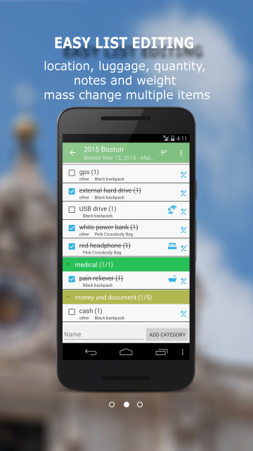 카테고리, 위치, 수하물별로 항목을 그룹화할 수 있습니다. 각 항목에는 메모, 수량 및 중량 필드도 있습니다. 대량 변경 기능을 사용하면 목록을 더 쉽게 편집할 수 있습니다. 목록을 이메일로 보내거나 공유할 수도 있습니다. 수하물 분실 시 목록 사본을 인쇄해 두시면 도움이 됩니다.