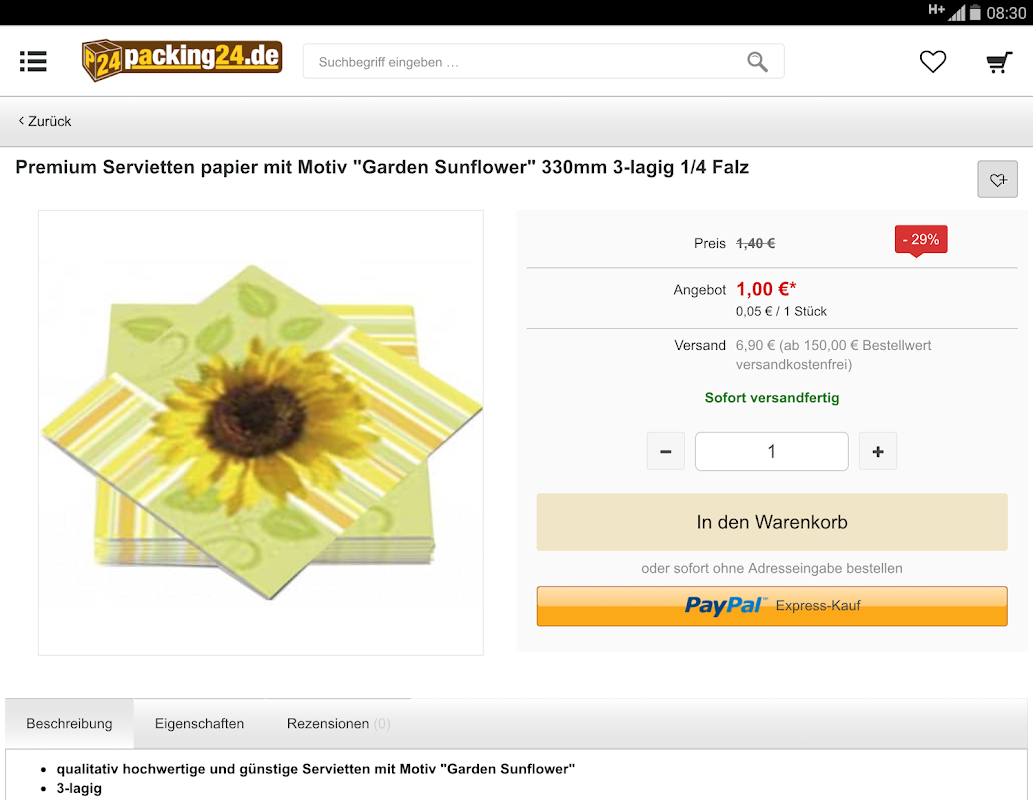포장 및 컵 일회용 아이템, 커피 인터넷에 Packing24.de 시장의 선두 주자 안전하고 싼이 응용 프로그램의 도움으로 신속하게 구입 컵, 일회용 식기, 일회용 수저, 파티 용품, 산업, 배송 및 선물 포장을 이동합니다. 손님들은 큰 위생 및 청소 액세서리 및 지불의 다른 유형의 다양한 혜택을 누릴 수 있습니다.