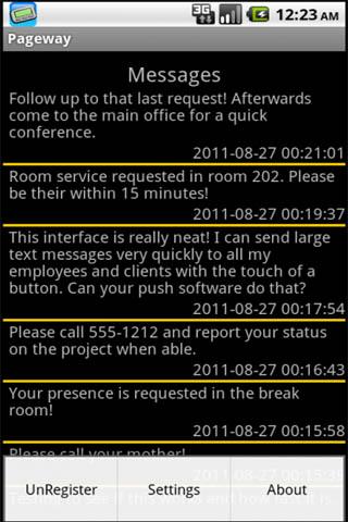 Pageway is a message receiver (virtual pager)* that is Android based and works using the Google Cloud Messaging technology. Receive and store messages separate from your SMS/MMS service. Addon as a feature to receive duplicates from your existing pager or SMS device.