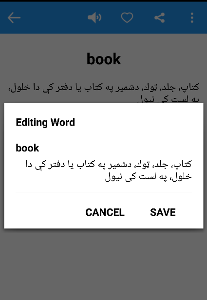 참고 : 우리는 2012 년 11 월에 발매 된 파슈토어 사전 (검은 색과 녹색 아이콘 (پ 편지)의 이전 버전을 게시되지 않은, 대신 새로운 앱을 출시했다.