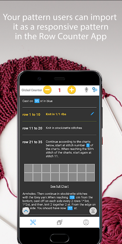 Patternum으로 만든 패턴은 완벽한 제작 경험을 위해 앱에서 니트 터와 크로 셰터가 사용하거나 PDF로 다운로드 할 수 있습니다.