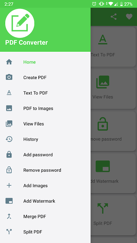 PDF Converter app allows you to convert all type of image and also text file to pdf. Also this app provides more functionality like protect pdf file using password, add watermark, merge pdf files in single pdf, remove duplicate pages and many more.
