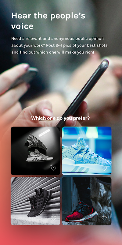 Post up to 4 different photos of something you can’t choose between and get instant feedback from a worldwide community! Our system matches you with peers of relevant age and interests, so that they can help you make the right decision. You’ll also be able to pay them back by voting on their polls and earn some Peerpoints by doing that.