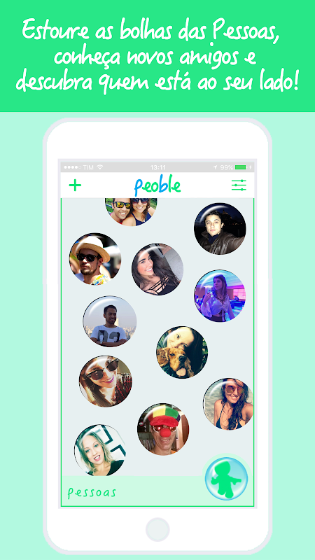 Estourar as bolhas de PESSOAS que estão pertinho de você ou em qualquer outro lugar do mundo da sua escolha. Participe de chats com elas e compartilhe conteúdo multimídia de qualquer tipo em tempo real.