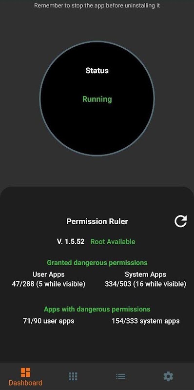 화면을 끄면 Permission Ruler가 모든 앱의 모든 권한을 취소합니다(무시되지 않는 한). 화면을 켜면 모든 권한이 다시 부여됩니다(잠긴 경우 제외).