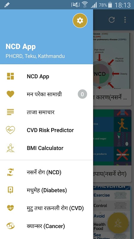PHCRD NCD App provides a wonderful user interface to become acquainted with different aspects of non communicable diseases. With the App, users can use BMI calculator, CVD Risk Predictor Tool and become conversant with four NCDs mainly : CVD, Cancer, Diabetes and COPD. Users can also view latest news concerning NCDs in Nepal and can add articles to favorite list. To sum up, NCD App enriches you with tremendous knowledge regarding various credentials of non communicable diseases.