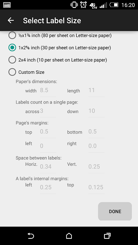 응용 프로그램은 완전히 페이지 크기, 페이지 당 레이블 및 개별 라벨 내도 여백을 사용자 정의 할 수 있습니다.