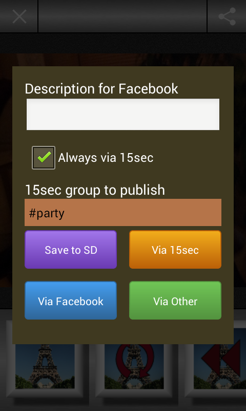 15sec can also integrate with the photogallery of the Android device, so you can share the pictures located in a gallery as well. Sharing from 15sec can be done in example with MMS, E-mail or through social media platforms like Facebook.