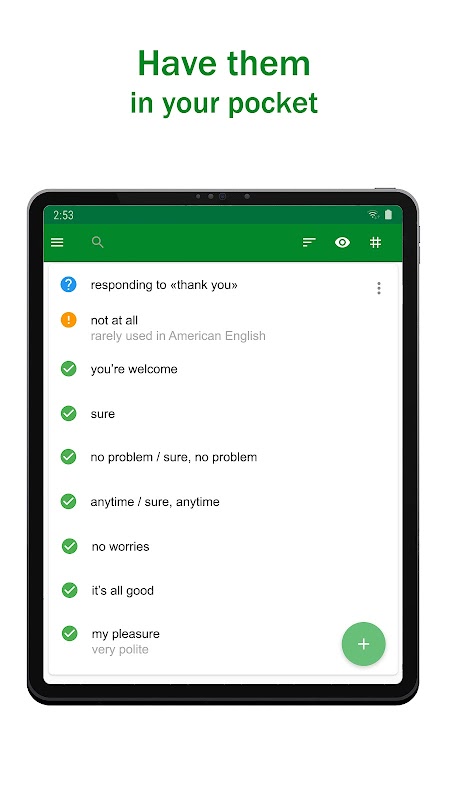 - 언어별로 구와 표현을 정리하고(둘 이상의 언어를 배우는 경우) 태그를 지정합니다. 원하는 문구를 쉽고 빠르게 찾는 데 도움이 됩니다.