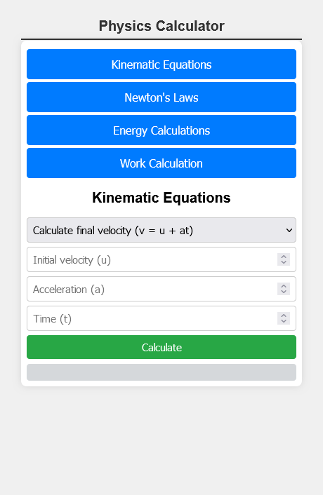 물리 계산기 앱은 운동 방정식을 사용하여 변위, 속도, 가속도 및 시간에 대한 정확한 계산을 제공합니다. 균일한 가속 또는 감속을 처리하든 당사 앱은 귀하의 연구와 연구를 지원하는 결과를 제공합니다.