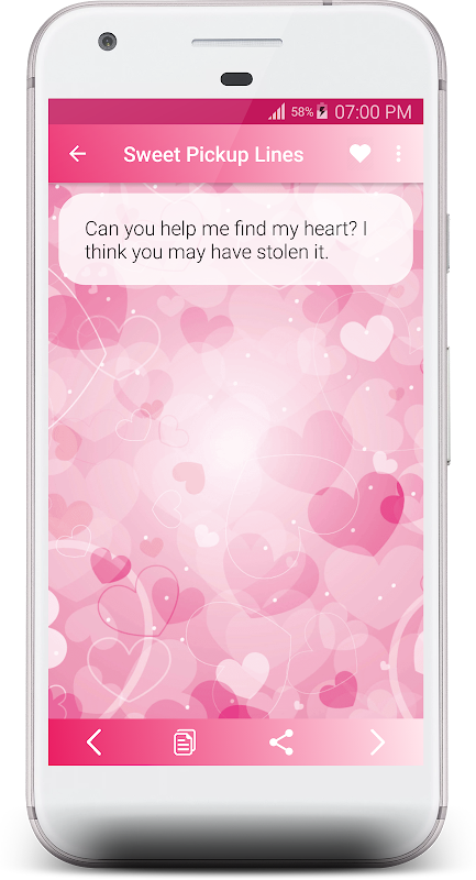 이 응용 프로그램에서 우리는 당신이 사용할 수있는 가장 재미있는 픽업 라인 중 일부를 수집했으며, 대화가 결국 첫 번째 어색한 "안녕하세요"(지점이 맞습니까?) 여기서는 "픽업 라인-꼬리 치는 메시지"를 제공합니다.