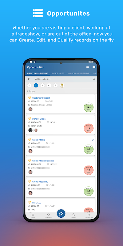 Pipeliner CRM Mobile App은 안드로이드 기기와 완벽하게 작동하도록 최적화되어 있으므로 언제 어디서나 판매 데이터에 액세스 할 수 있습니다.