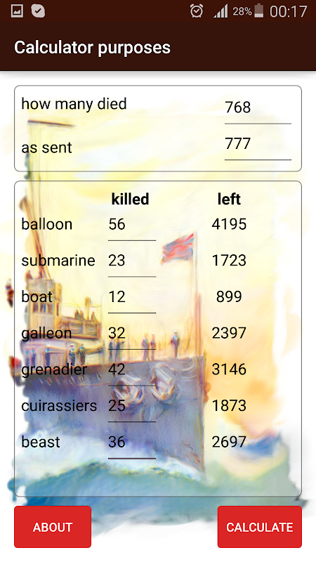 Приложение будет незаменимым помощником в прохождении локаций игры Кодекс_Пирата и получении на них приза. Дополнительно можно рассчитать количество оставшихся войск, как по целям, так и у противника ( на острове, тайнике, хранилище ,оккупации, колонии) без использования разведки (атака боем).