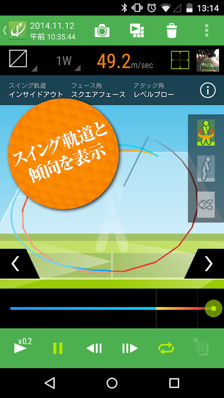 전용 센서와 연동하여 스윙 동영상 자동 촬영 데이터 분석을 할 수있는 어플리케이션입니다. 스윙 동영상에 선을 그어 자신의 스윙의 문제를 확인 할 수 있고, 충실한 비교 재생 움직임의 차이를 확인할 수 있습니다.
