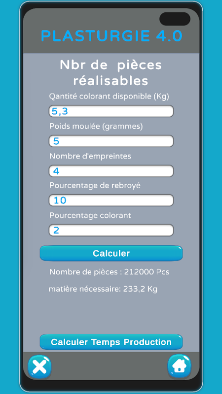 이 소프트웨어는 플라스틱 산업 또는 산업 전반에서 생산 계산을 단순화하는 것을 목표로 합니다. TRS, PPM, 스크랩 비율, 특정 부품 수를 만들기 위한 생산 시간, 이러한 부품을 만드는 데 유용한 처녀 재료 및 염료의 양을 빠르게 계산할 수 있습니다. 소프트웨어는 인상 수, 재분쇄 및 염료 비율과 같은 플라스틱 사출의 특수성을 고려합니다. 소프트웨어는 서로 독립적으로 수행할 수 있는 계산으로 구성되어 있으며 사료 중량, 재분쇄 비율, 착색제 비율, 충치 수, 주기 시간 또는 케이던스와 같은 데이터를 저장할 수도 있습니다. 다시 입력할 필요 없이 모든 계산에 사용하십시오. 이 소프트웨어는 ERP를 대체하기 위한 것이 아니지만 예를 들어 생산을 완료하기에 충분한 염료나 재료가 남아 있는지 신속하게 알 수 있습니다. 새 주문을 수락할 수 있는지 알기 위해 기계 사용 일수1024일을 알 수 있습니다. TRS 또는 PPM을 즉시 알 수 있습니다. 제조 주문 데이터가 현장의 현실과 일치하는지 몇 초 안에 확인합니다. 정보를 얻기 위해 손으로 다양한 계산과 변환을 수행해야 하는 수고를 덜어주는 플라스틱 산업 또는 일반 산업 전용의 일종의 빠른 계산기입니다.