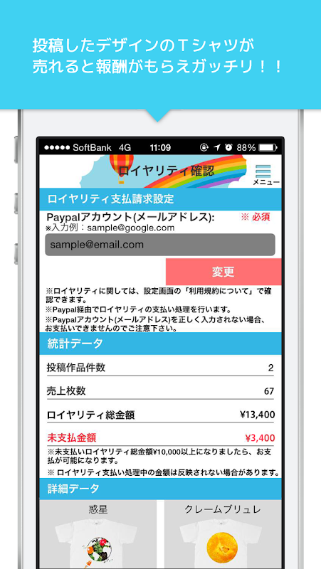 あなたの作品にファンがつき、そのファンがTシャツを購入したら1着につき200円のロイヤリティを得る事ができます。