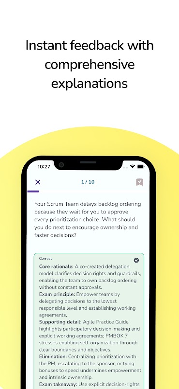 다른 앱과 달리 Pocket Study는 단순한 문제풀이 이상의 기능을 제공합니다. 각 항목에 대한 심도 있는 설명을 통해 이론을 실제 프로젝트 관리 시나리오와 연결하는 데 도움을 줍니다. 적응형 학습, 도메인별 퀴즈, 전체 길이의 시뮬레이션을 통해 현재 위치와 개선 방법을 항상 파악할 수 있습니다.