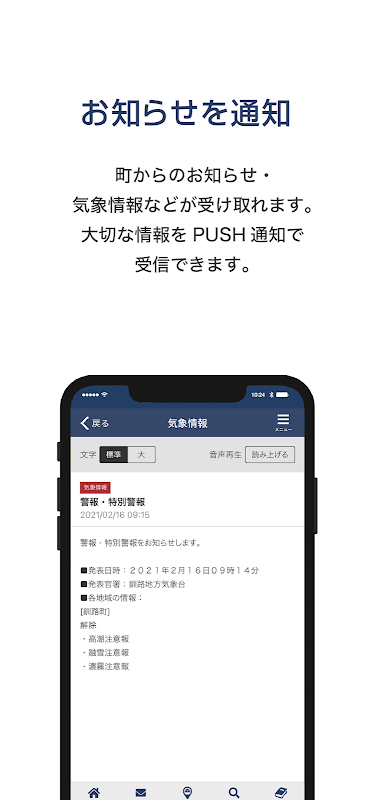 기상청 등이 발표하는 지진 · 기상 · 해일 정보와 마을이 발표하는 피난 지시 · 권고 등의 재해 정보는 물론, 평소의 생활에 도움이되는 행정으로부터의 소식이나 이벤트 정보 등 다양한 정보를 편리한 푸시 알림으로 손끝에 도착합니다.
