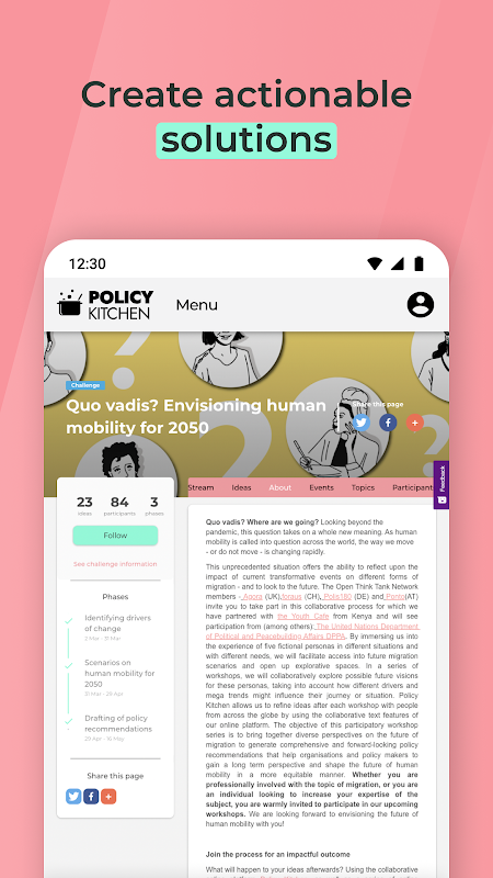 Policy Kitchen 앱을 통해 이제 전화로 정책 아이디어를 제출하고, 전문가 및 국제 정책 애호가와 협력하고 연결할 수 있습니다.