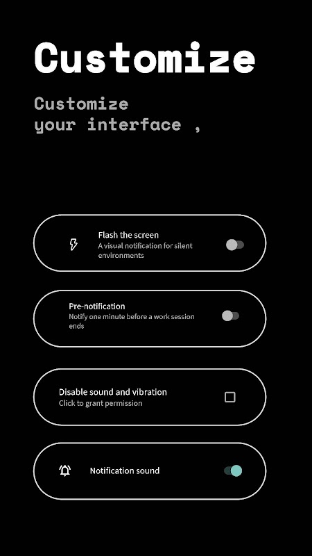 • 사용자 지정 가능한 알림: 타이머가 종료되거나 휴식 시간이 다 된 경우와 같이 Pomodoro 앱이 보내는 알림을 사용자 지정할 수 있습니다.