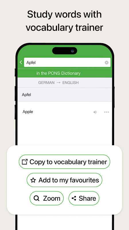 검색어를 입력하거나 말하면 더 빠르고 편리하게 검색할 수 있도록 시스템에서 단어와 구문에 대한 제안을 제공합니다. 앱이 PONS 사전에서 결과를 찾을 수 없는 경우 통합 텍스트 번역 서비스가 시작되어 원하는 결과를 제공합니다.
