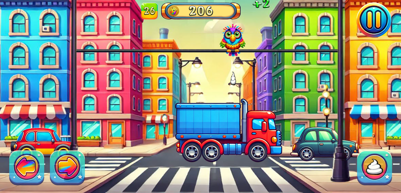 장난꾸러기 새가 되어 하늘로 날아오르며 거친 라이딩을 준비하세요! 이 재미있는 모바일 게임의 목표는 간단합니다. 최대한 많은 자동차를 조준하고, 떨어뜨리고, 똥을 싸는 것입니다. 직관적인 컨트롤과 끝없는 재미로, 도전 과제는 드롭 시간을 완벽하게 맞춰 큰 점수를 얻는 것입니다. 장애물을 피하고, 파워업을 수집하고, 높은 점수를 위해 친구들과 경쟁하세요. 빠르게 웃기를 원하시거나 정확도를 테스트하기 위한 게임을 원하신다면, 끝없는 재미를 위한 완벽한 선택이 될 것입니다. 그들이 도망가기 전에 얼마나 많은 자동차를 칠 수 있나요?