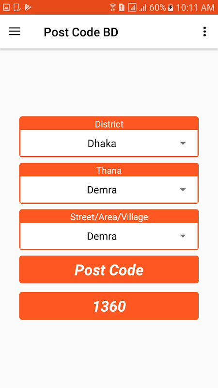 간단한 드롭 다운 목록을 사용하여 지역, thana, 거리 / 지역 / 마을을 선택하여 우체국을 선택한 다음 원하는 코드를 표시 할 수 있으며 방글라데시의 모든 지역에 대한 UI 및 우편 번호가 있습니다.