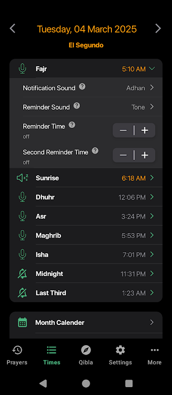아단 알람, 기도 일정 및 키블라 방향이 포함된 이슬람 기도 시간입니다.