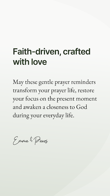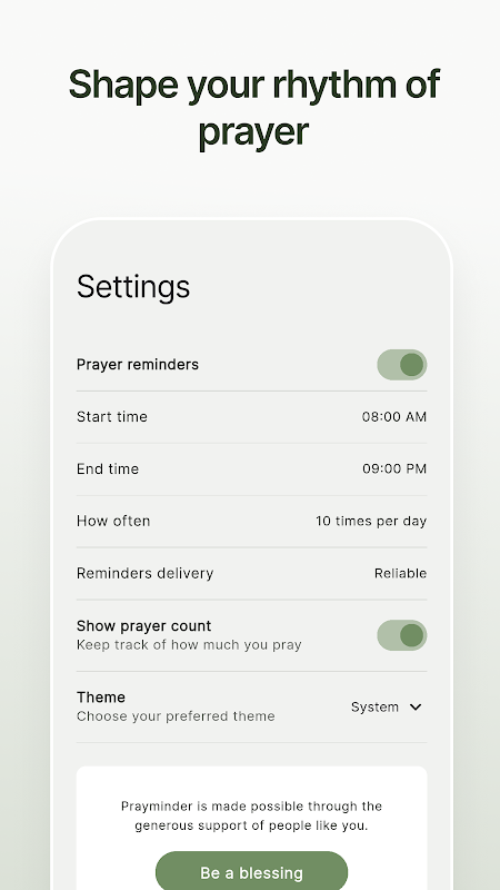 부드러운 기도 알림은 당신의 기도 생활을 변화시키고, 현재 순간에 대한 집중을 회복하며, 일상 생활에서 하느님과의 친밀감을 일깨우는 힘을 가지고 있습니다. Praymininder는 사용이 쉽고 무료이며 전 세계 수많은 기독교인의 삶을 변화시킨 강력한 도구입니다.
