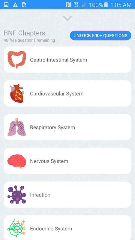 응용 프로그램은 임상, OTC, 법률, 기타 및 무작위 : 5 카드로 나뉩니다. 임상 섹션에는 BNF의 16 개 챕터가 모두 포함되어 있습니다.