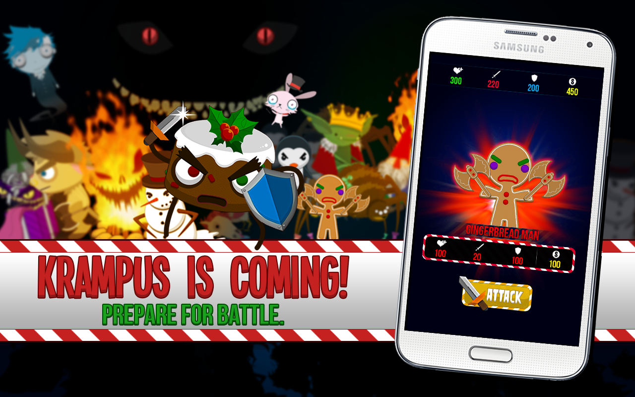 With the clear and present danger of the holiday season—cut throat shoppers, deadlines, monsters—one can never be too prepared. Stock up on swords, boomerangs, and weaponized yo-yos this holiday season as you wage battle against the dangers presented to you in gift form: killer spiders, xmas gingerbread men, gnomes, goblin kings, combative fruit cakes, and of course the fearsome Krampus. Strategize as you fight your way to victory on the score boards. Collect weapon stats or sell them for precious gold, being sure you’re always strong enough to defeat an endless stream of enemies.
