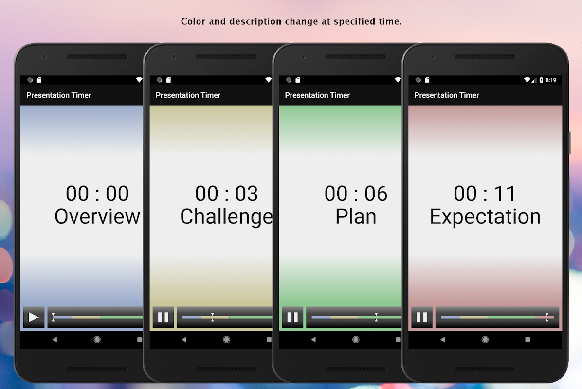 Presentation Timer는 미디어 플레이어 방식으로 설계 한 시간 간격을 표시합니다. 타임 라인을 직접 터치하여 지정된 시간에 타이머를 시작할 수 있습니다. 플레이어는 실행하는 동안 시간 간격의 시간, 색상 및 스크립트를 표시합니다. 이 정보는 프레젠테이션 진행 상황을 명확하게 보여줍니다. 타이머는 모든 시간을 변경, 추가 또는 제거 할 수있는 무제한의 시간 간격을 제공합니다. 휴대 장치의 화면을 보는 것이 적합하지 않은 경우, 타이머는 신호가 진동에 의해 전달되는 포켓 모드를 지원합니다.