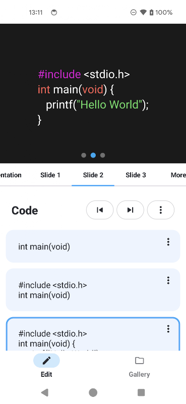슬라이드를 만들어 애니메이션으로 코드를 표시합니다. 개발자에게 적합