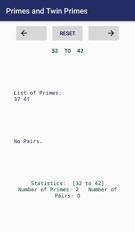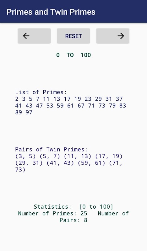 소수와 쌍둥이 소수 쌍의 예상 목록을 얻는 것 외에도 앞으로 및 뒤로 탐색도 가능합니다. 응용 프로그램은 또한 범위 내의 소수 및 쌍둥이 소수 쌍의 개수를 제공합니다.