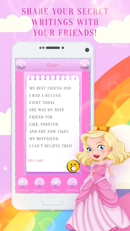 Keep your secrets safe inside of a beautiful “secret diary with a fingerprint” lock for girls! If you are searching for a diary that you can draw and write in, the 🎀”Princess Diary with Lock”🎀 is just perfect for you! Download the diary free app with lock for girls with everything! Feel free to confide in the princess diary with password! This secret diary with my photo can be your new best friend. Write diary every day! Have one of the best secret diary books for girls with lock with photos on your device! Preserve your memories with the help of the pink “glitter diary” with lock! Use the princess personal diary as a reminder app and you won't forget about any future events ever again! Note down your love story in a a personal diary and journal i can write in with a lock code! Tell your secret hidden diary you deepest thoughts! Set a unique password (pin, fingerprint, or pattern) to prevent everyone from reading my secret “diary”!