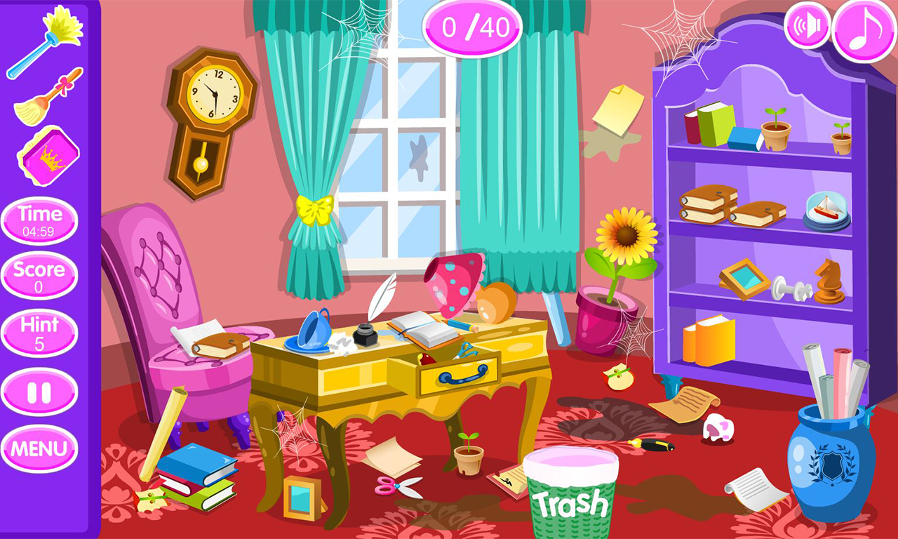 왕족을 위해 일할 때, 특히 공주에 관해서 때때로 그들은 난잡하게 만들 수 있습니다. 이 공주 방 청소 게임으로 당신은 공주가 돌아오기 전에 재미있게 당신의 공주 방을 청소할 수 있습니다. 여기서 당신은 가구, 조명, 벽걸이를 바로잡고, 거미줄을 청소하며, 인형과 기타 항목들을 재배열할 뿐만 아니라 쓰레기를 버리고, 얼룩을 없애며, 바닥을 쓰는 등 많은 것을 할 수 있습니다! 그러니 만일 당신이 도전을 원하고 자신의 청소 능력을 테스트하고 싶다면, 무료로 이 온라인 공주 방 청소 게임을 하면서 당신이 왕족을 위해 일할 수 있는 자질이 있는지 알아보는 것이 어떻습니까.