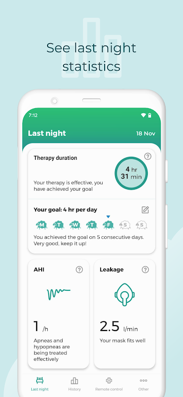 prisma APP는 맞춤형 팁 및 권장 사항과 함께 치료에 대한 의미 있는 정보를 제공합니다. 자신만의 치료 목표를 설정하고 치료 진행 상황에 대한 정보를 받아볼 수 있습니다. 치료 일지를 열고 개인 보고서를 생성할 수도 있습니다. 마지막으로 prisma 앱을 사용하면 필요에 따라 데이터를 의사나 기기 판매점에 전송할 수 있습니다. Wear OS 스마트워치에서 전날 밤의 치료 데이터를 볼 수도 있습니다.