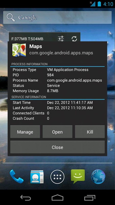 I wanted a simple widget that would show what's currently running on my device, how much free memory I had, and allowed me to quickly manage processes to free up memory.