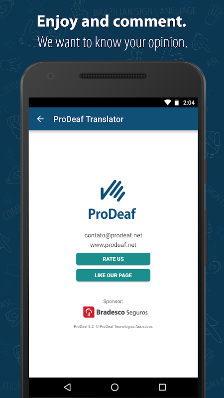 O aplicativo ProDeaf foi projetado e desenvolvido com tecnologia totalmente brasileira pela ProDeaf Tecnologias Assistivas. Contamos com o patrocínio da Bradesco Seguros.