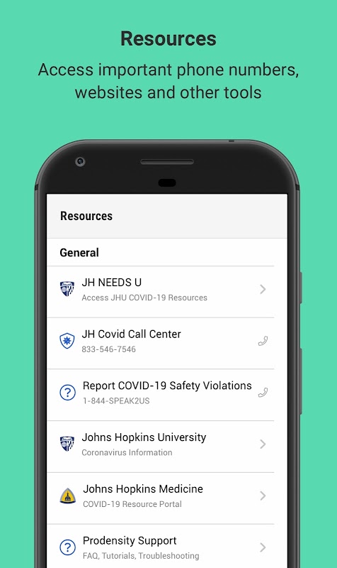 The app allows participants to access campus and contribute to the health of the community by completing a health check every 12 hours. Completion of the health check (with no symptoms or exposure) and other checklist requirements displays a mobile The Johns Hopkins Prodensity mobile app provides resources for a safe return to campus. The app will help you follow Johns Hopkins guidelines to keep the community safe through health checks, access to important resources, density monitoring, and alerts.