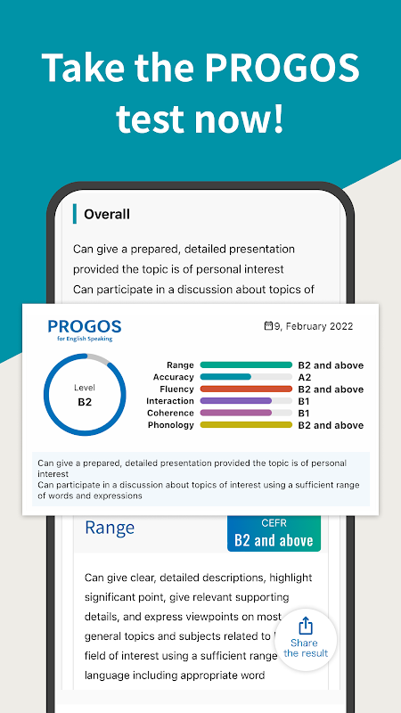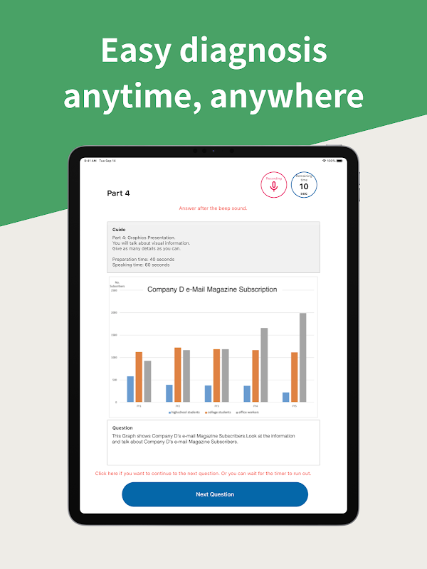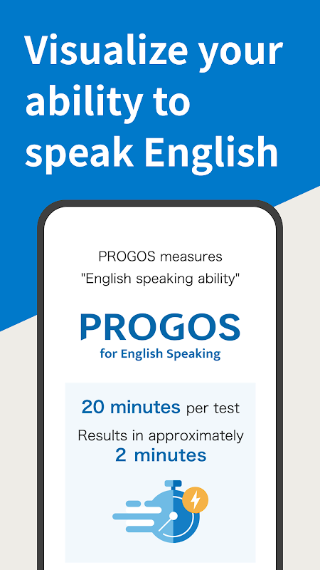 테스트 실행: PROGOS 앱을 다운로드하고 20분 동안 말하기 테스트를 완료하세요. 이 테스트는 영어 말하기 능력을 종합적으로 평가하도록 빠르고 효율적으로 설계되었습니다.