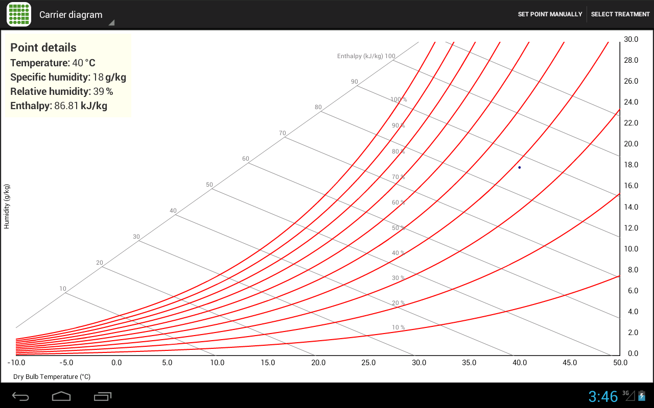 Free psychrometric utility App, very useful for all HVAC producer. By tapping once on the chart, it lets you calculate the Air Specific Humidity, Relative Humidity and Enthalpy of a specific point. Instead if you drag a point to another, it lets you calculate air treatments like Heating, Cooling, Humidification and Steam Humidification.