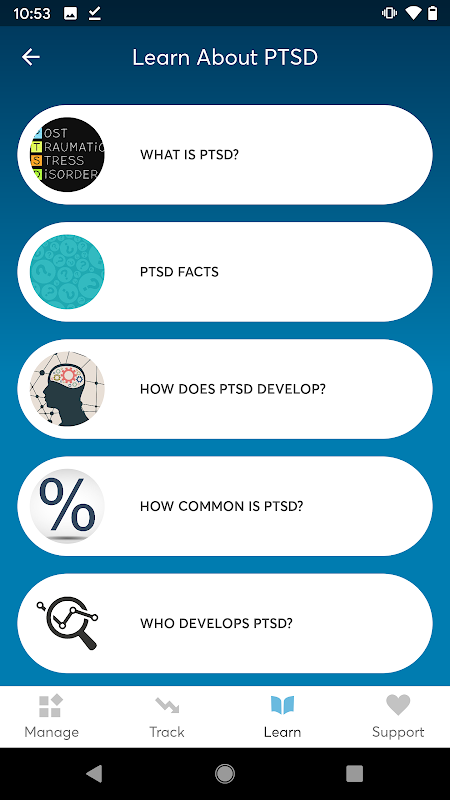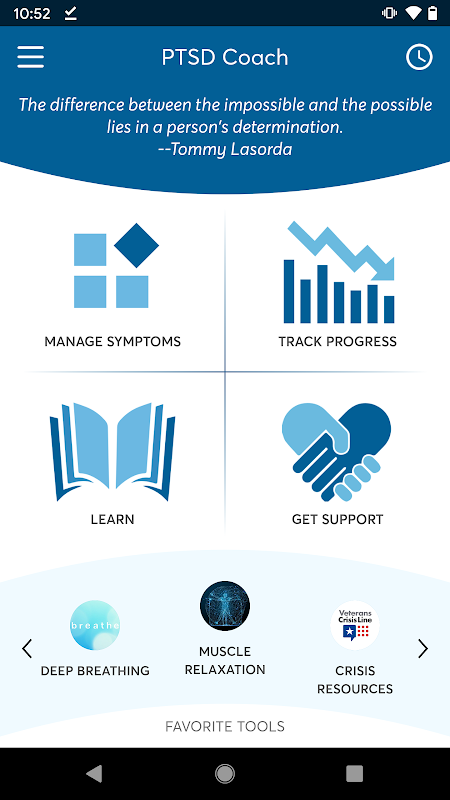 PTSD 코치는 재향 군인과, 또는있을 수 군 장병, 외상 후 스트레스 장애 (PTSD)를 위해 설계되었습니다. 이 응용 프로그램은 PTSD, 전문 관리, PTSD에 대한 자체 평가, 지원을 찾을 수있는 기회를, 사용자가 PTSD와 일상 생활의 스트레스를 관리 할 수있는 도구에 대한 정보에 대한 교육을 사용자에게 제공합니다. 도구 이완 기술과 분노 관리 및 기타 일반적인 자조 전략에 긍정적 인 자기 이야기 이르기까지 다양합니다. 사용자는 기본 설정에 따라 도구를 사용자 정의 할 수 있습니다 자신의 연락처, 사진, 음악을 통합 할 수 있습니다. 이 응용 프로그램은 치료뿐만 아니라하지 않은 사람들에있는 사람들에 의해 이용 될 수있다.