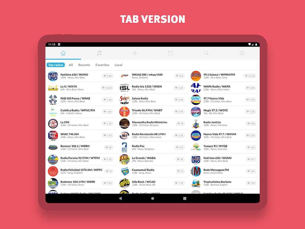 간단하고 효율적이며 빠릅니다. 당사의 라디오 플레이어는 99.1 Salsoul, WKAQ 580, La X, WAPA, Fidelity 95.7, Magic 97.3, Salseo, El Jibarito, Noti Uno 630, Isla 1320, Tropicalísima Bachata, Salsa Hits, PAB 550 Ponce WPAB, Puerto Rico, Triunfo 96.9 WNRT과 같은 푸에르토리코의 가장 인기 있는 라디오 방송국과 정기적으로 업데이트되는 제안 덕분에 발견할 수 있는 기타 많은 라디오 방송국을 실시간으로 듣는 데 이상적입니다.